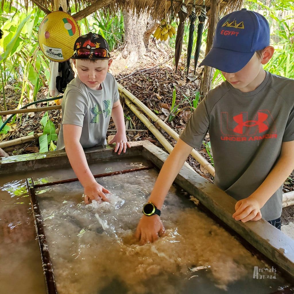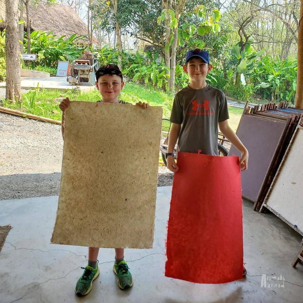 It may sound gross, but the elephant poop is thoroughly cleaned and sanitized before kids get to work. Our boys loved getting their hands into the papier-mâché-like mixture, joking that they were making poopoo paper!