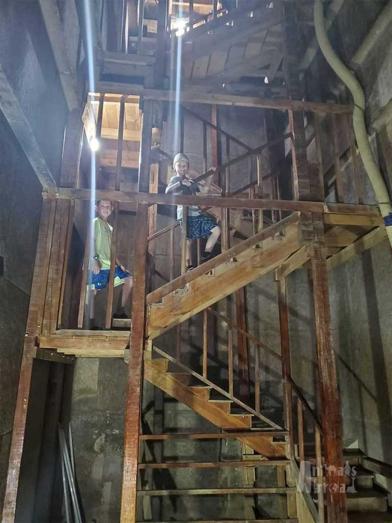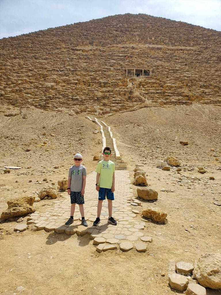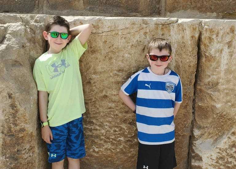 Surprisingly, the sides of the pyramid weren’t smooth. The outer casing stones that once gave it a polished finish have eroded over time, revealing the core, thousands of rough-cut blocks fitted tightly together. Many of these are larger than our boys, and no two are exactly the same. The irregular blocks fit together like a giant, ancient puzzle.