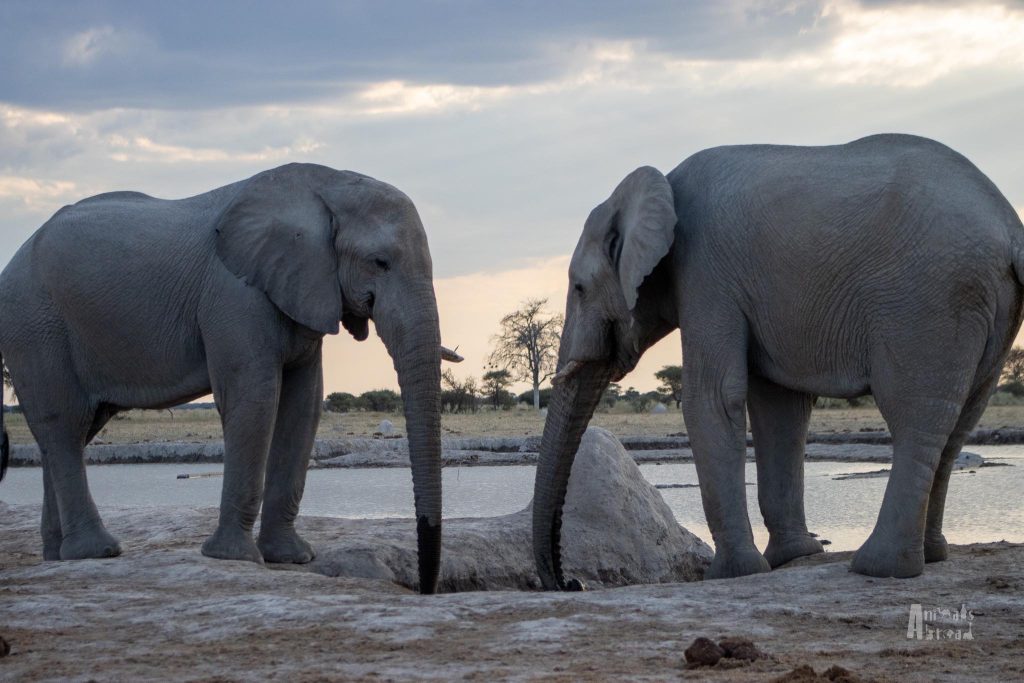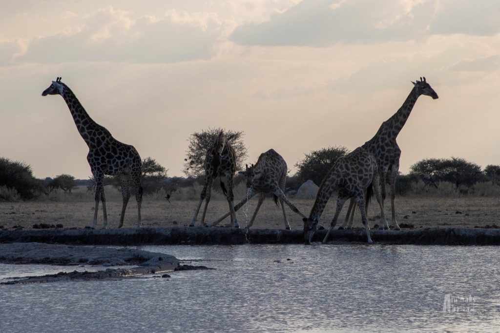 Like Etosha National Park, the waterhole came alive at night. We arrived as the sky shifted from golden hues to pinks and purples. Dusk was upon us. A family of giraffes stepped into the pale light, their silhouettes striking against the open plains.