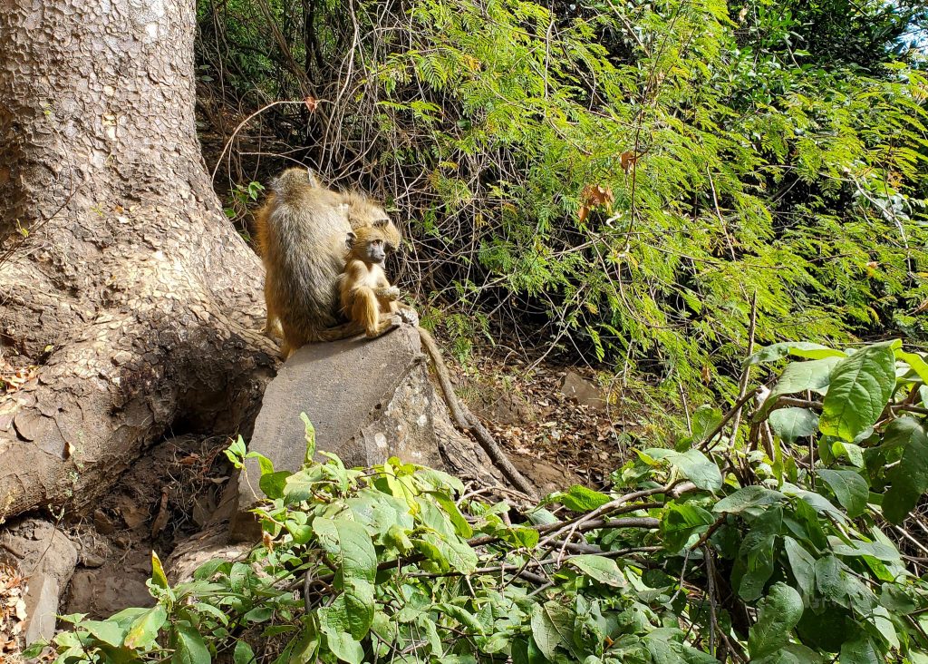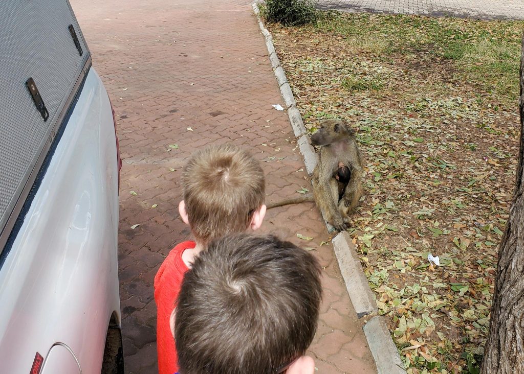 We also had a few close encounters with the locals — baboons. Dozens of them swung through the trees, lounged along the trail, and leaped across railings as we made our way to the riverbed. The boys loved watching them up close, but we had to be cautious.
