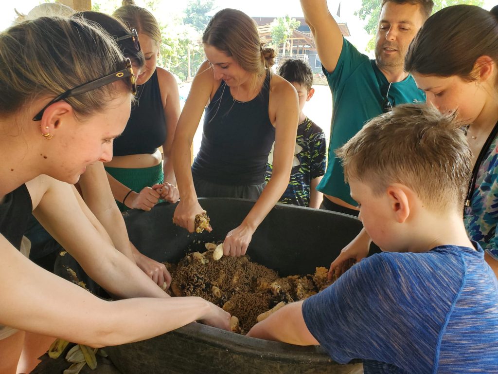 The final activity of the day was preparing snacks for the elephants. In large tubs, we mixed rice and bananas together by hand, mashing everything into soft balls. Before long, we were all a sticky mess—laughing, covered in banana, and fully committed to the process.