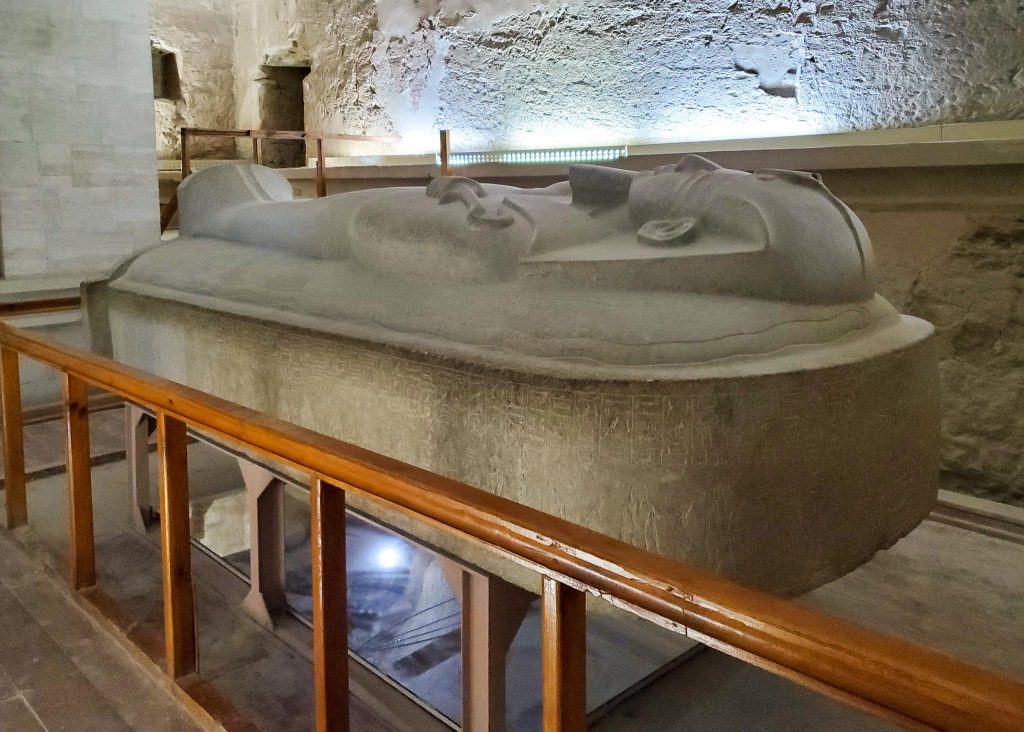 It’s known for its large pink granite sarcophagus, as well as its vibrant colours and detailed artwork—especially on the ceilings, where golden symbols stand out against a deep blue background. Many say the colours look almost newly painted despite being over 3,000 years old.